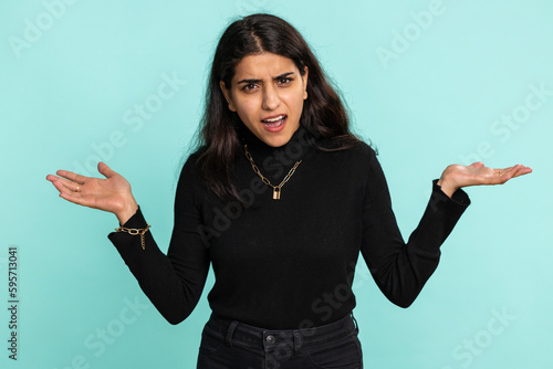 What Why. Sincere irritated indian woman raising hands in indignant expression asking reason of failure demonstrating disbelief irritation by trouble. Pretty confused hindu girl on blue background