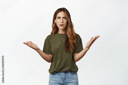 What wrong. Confused and frustrated middle aged woman, wife looks questioned, frowning puzzled and spread hands sideways, doesnt get a clue whats happening, white background