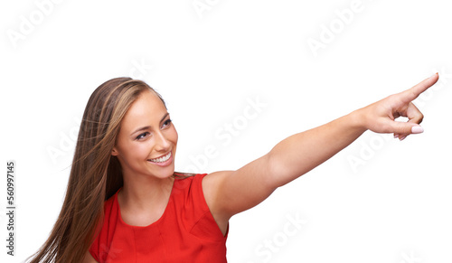 White background, pointing finger and face of woman for advertising, marketing and fashion. Beauty, cosmetics and girl model with copy space for deal, sale and product placement isolated in studio