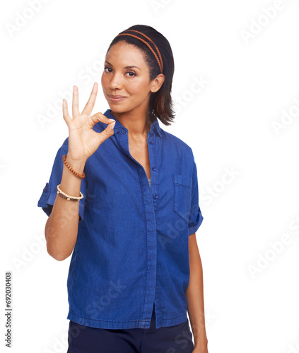 White background, portrait or black woman with okay hand sign for support, agreement or feedback. Good review, face or happy person in studio with opinion or perfect gesture for approval, like or yes