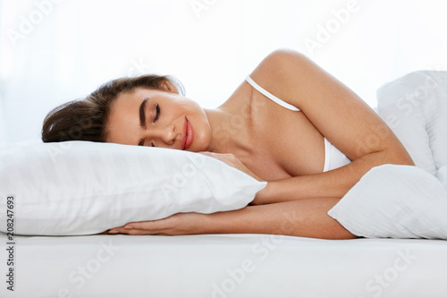 White Bedding. Woman Sleeping On Mattress With Pillow.
