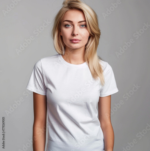 white plain t shirt, white female with blonde hair wearing it, studio light front view