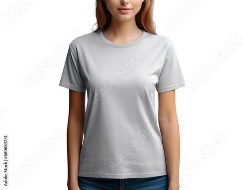 white t-shirt mockup on a woman, png file of isolated cutout object with shadow on transparent background.