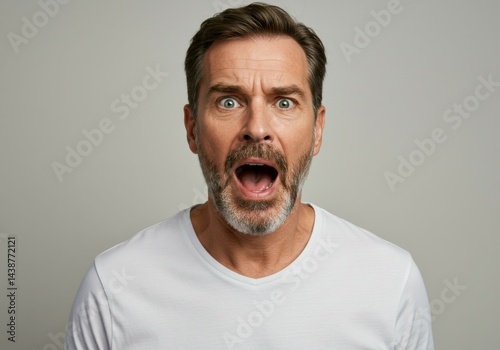 White t-shirted man making dramatic shocked face.