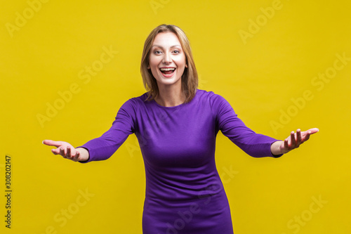 Wide open hug. Nice to meet you! Portrait of generous woman in elegant tight purple dress standing with wide raised arms and welcoming or sharing smth. indoor studio shot isolated on yellow background
