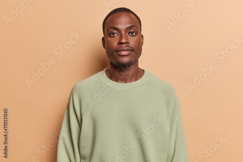 Wide shot portrait of serious dark skinned man with beard looking directly at camera listens information attentively dressed in casual sweatshirt isolated over brown background. Human face expressions