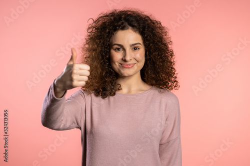 Winner. Success. Positive girl making thumbs up sign over pink background and smiles to camera. Body language. Young curly woman with trendy glitter freckles make-up