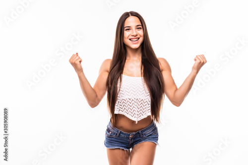 Winning success woman happy ecstatic celebrating being a winner. Dynamic energetic female model isolated on white background waist up.