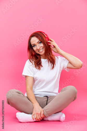 Winsome cheerful stylish young woman wearing white shirt sitting on hunkers isolated over pink background while listening to music with wireless headphones