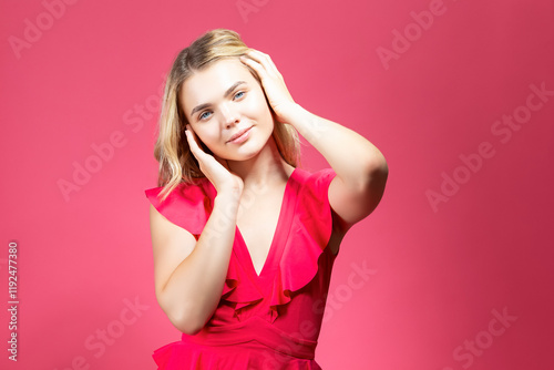 Winsome Nice Smiling Blond Caucasian Girl in Pink Red Dress Over Coral Red Background