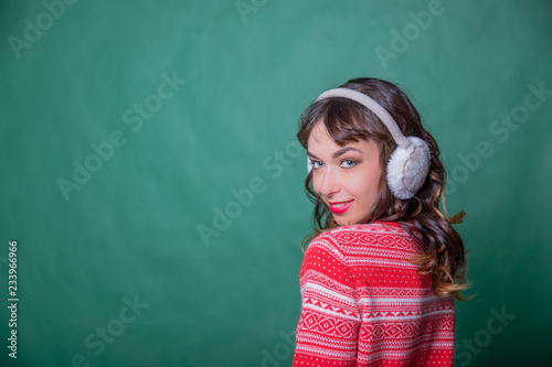 Winter Beauty Woman on green wall background. Winter holidays concept. Skin and hair care in cold season. Beautiful woman with long hair wearing sweater and earmuffs.Copy space