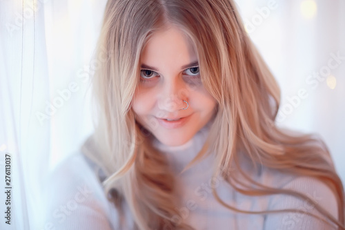 winter blonde / young adult model, blonde with long beautiful hair posing in the winter season