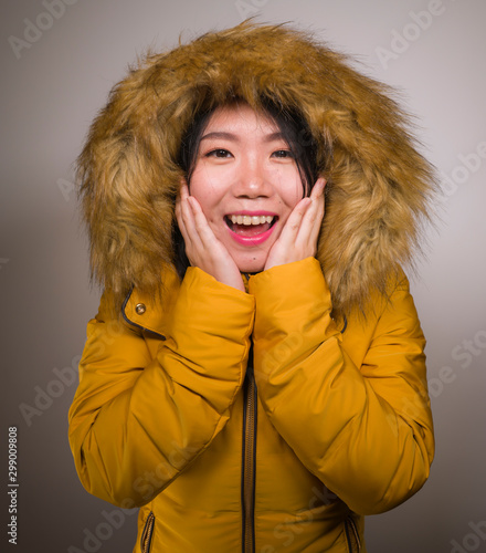 winter fashion isolated portrait of young beautiful and happy Asian Chinese woman in warm yellow feather jacket with fur hood gesturing cheerful and playful smiling