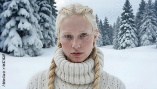 Winter Portrait: A stunning individual with flowing blonde braids stands amidst a snowy wonderland, her intense gaze capturing the serene beauty of a cold, crisp winter day.