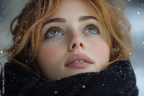 Winter serenity: close-up of woman with snowflakes and warm scarf