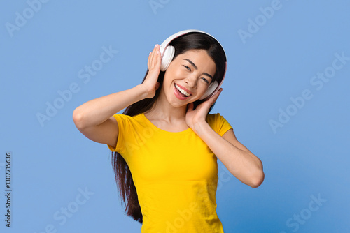 Wireless headphones for music. Portrait of happy asian girl enjoying listening favorite songs, posing over purple background with empty space