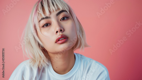 With a slightly tilted head, a stylish woman with a tousled blond bob and light makeup stands against a soft pink backdrop, radiating casual elegance.