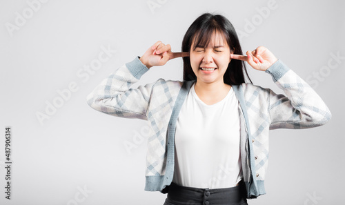 Woman bad mood pain her closed ears with finger and close eyes, Asian beautiful young female covers ears for loud noise, studio shot isolated on white background with copy space