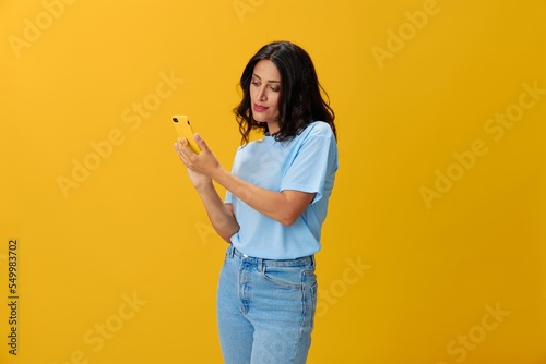 Woman blogger with a phone in her hands in a blue t-shirt and jeans on a yellow background smile signs gestures symbols, online communication and video call, copy space, free background