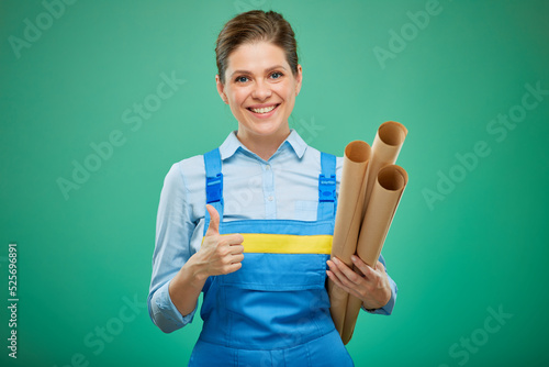 Woman builder worker in overalls with blueprints showing thumb up. Isolated portrait.
