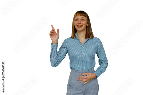 Woman businesswoman pointing gesture, smiling professional presenting new idea, explaining on transparent background