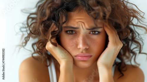 Woman clutches his head in despair,hands gripping head showing shocked, screaming, depressed expressions.