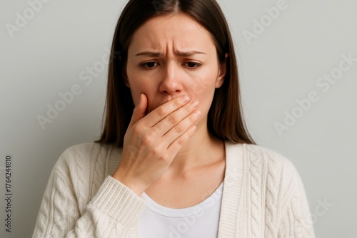 Woman covering mouth with hand showing discomfort or nausea, wearing white sweater, neutral background, expressing emotion or health concern concept. Ai generative