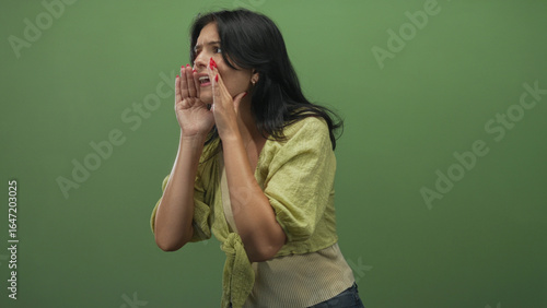 Woman cupping hands around mouth with focused expression in green studio to amplify her voice; urgent announcement.