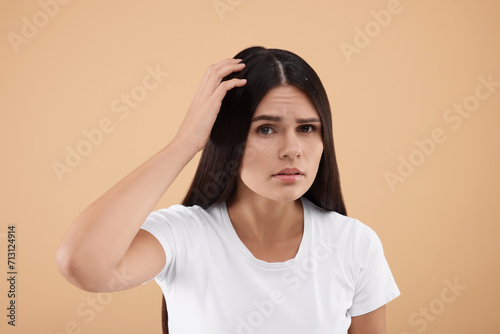 Woman examining her hair and scalp on beige background. Dandruff problem