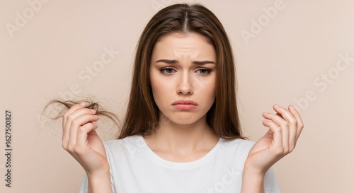 Woman experiencing hair loss. Female holding fallen hair. Hair problem and alopecia concept for trichology and dermatology clinic.