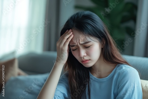 Woman experiencing headache in a cozy living space during daytime