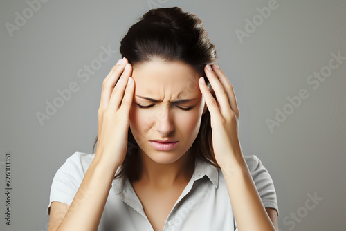 Woman Experiencing Severe Headache Portrait of a distressed young woman with her hands on her temples, conveying the pain of a severe headache or migraine.