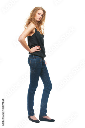 Woman, fashion and jeans in studio for portrait with confidence, style and isolated by white background. Person, girl or model with trendy clothes with edgy denim, cool and casual outfit in Ireland