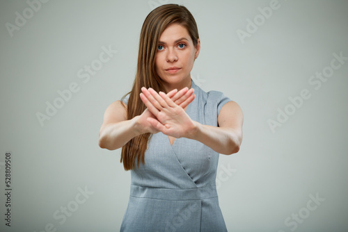 Woman gesturing stop with crossed hands. isolated female portrait.