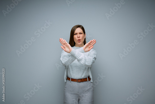 Woman gesturing stop with crossed hands. isolated female portrait.