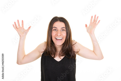woman hands up surprised portrait young pretty cheerful happy woman smiling laughing looking at camera over white background copy space