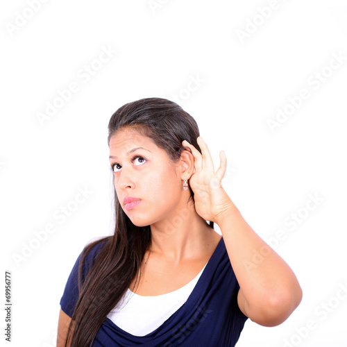 Woman holds her hand near ear and listens