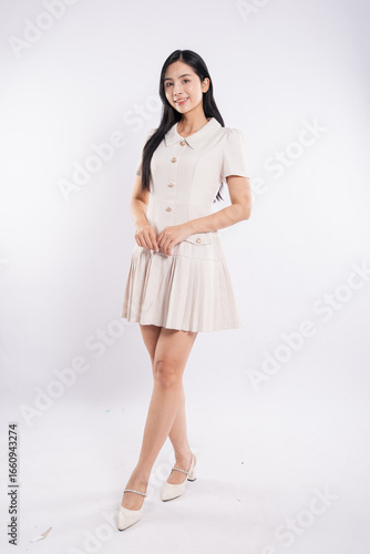 Woman in a beige dress with a pleated skirt and matching heeled shoes in a studio setting