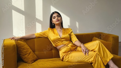 Woman in a bright yellow outfit lounging on a modern couch, showcasing contemporary style and trendy clothes.