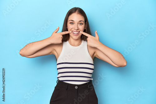 Woman in a striped top posing on a blue studio backdrop smiles, pointing fingers at mouth.