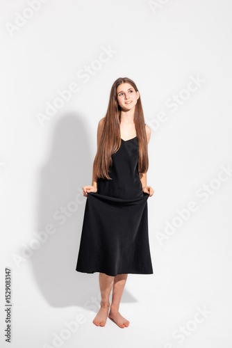 Woman in black dress stands barefoot with long hair against a plain white background during a casual indoor photoshoot