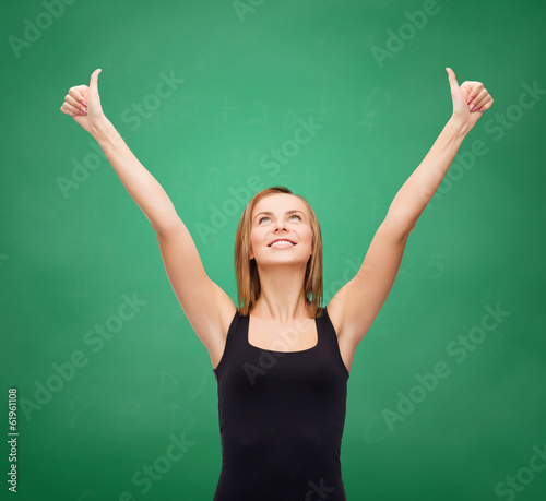 woman in blank black tank top showing thumbs up