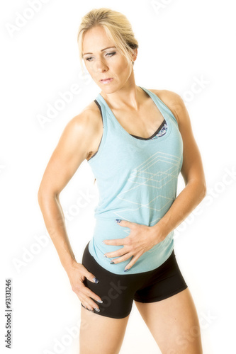 woman in blue fitness tank top hand on stomach