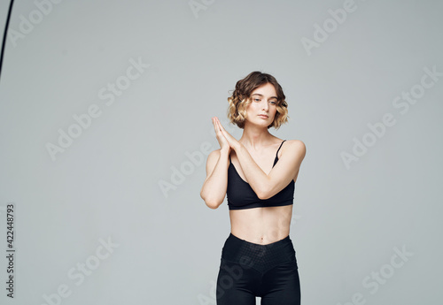 Woman in dark sportswear on gray background gesturing with hands cropped view