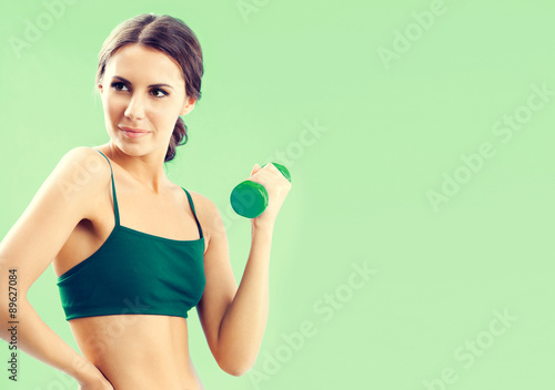 Woman in fitness wear with dumbbell, on green