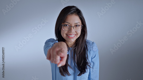 Woman in glasses points confidently, exuding self-assurance and approachability. Close-up shot accentuates her smile and direct gaze.