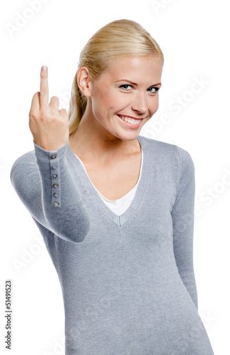 Woman in gray pullover showing obscene gesture