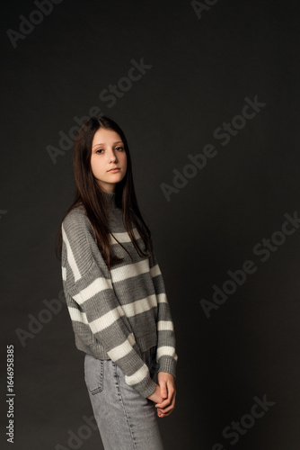 Woman in gray sweater in studio on black background