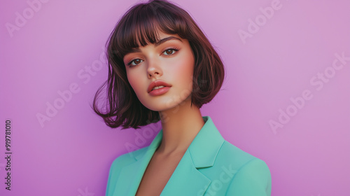 Woman in her 20s with a bob-cut brunette hairstyle and bangs, professional look, pastel purple background