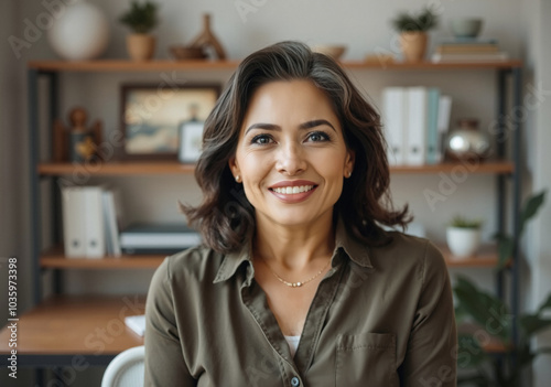 woman in her 40s with wavy hair, comfortable v-neck shirt, investor, elegant and compelling